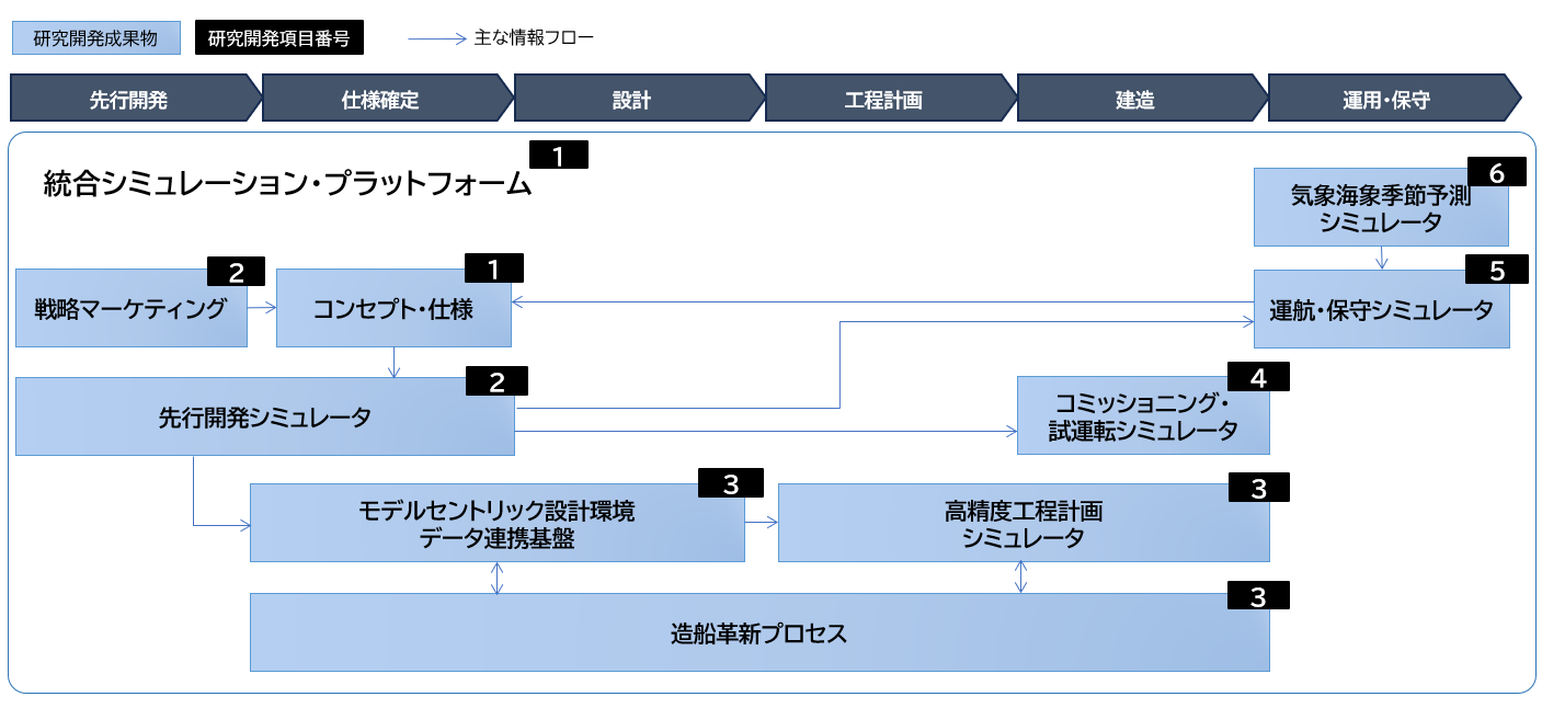 統合シミュレーション・プラットフォームの構成を基に、6つの研究開発項目における研究開発を推進し、3年後の2028年にはステージゲート評価等を含む中間評価を受け、5年後の2030年までに各研究開発項目成果物を統合して総合シミュレーション・プラットフォーム(下図)を構築し、実際の船舶建造での実証を目指します。