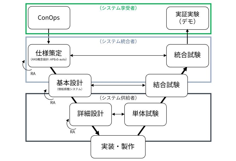 System of Systemsとして構築される自動運航船・自律運航システムを、ユーザー・享受者の目線を反映しながら上述のシステム統合プロセスに沿って構築するには、必要な機能・安全のための要件を洗い出し、システムやそれらの構成機器の実装や、船主・管理会社・運航会社の構成員による運用において必要な対応へと落とし込む営みが重要な役割を果たします。当社では、自動運航船に関する技術開発や実証プロジェクトへの参画を通じ、自律運航システムに関するコンセプト: “APExS-auto”(Action Planning and Execution System for fully autonomous ships)を策定し、操船のための状況認識・分析、計画立案や制御実行といった機能群や自動運航に付随する陸上からの支援機能が、システム享受者の目線で記述されるConcept of Operations(ConOps;運用設計仕様)を起点にどの様に構築・統合されシステムとして実現されるかを表すフレームワークとして記述しました。APExS-autoの特徴として、自動運航船・システムで想定される運用条件(ODD;運航設計領域)の下で,安全担保のために機械の判断・出力と人間の監視・承認を適切に組み合わせた運用を可能とするため、System of Systems全体にフォーカスしたリスクアセスメント手法を用いることによりシステムや使用者に課せられる要件を特定した点が挙げられます。これらの成果に対し,日本海事協会・アメリカ船級協会・ビューローベリタスの各船級協会*1から、Approval in Principle(AiP)としてコンセプトに対する技術的な実現可能性やリスク評価に関する認証を取得しています。