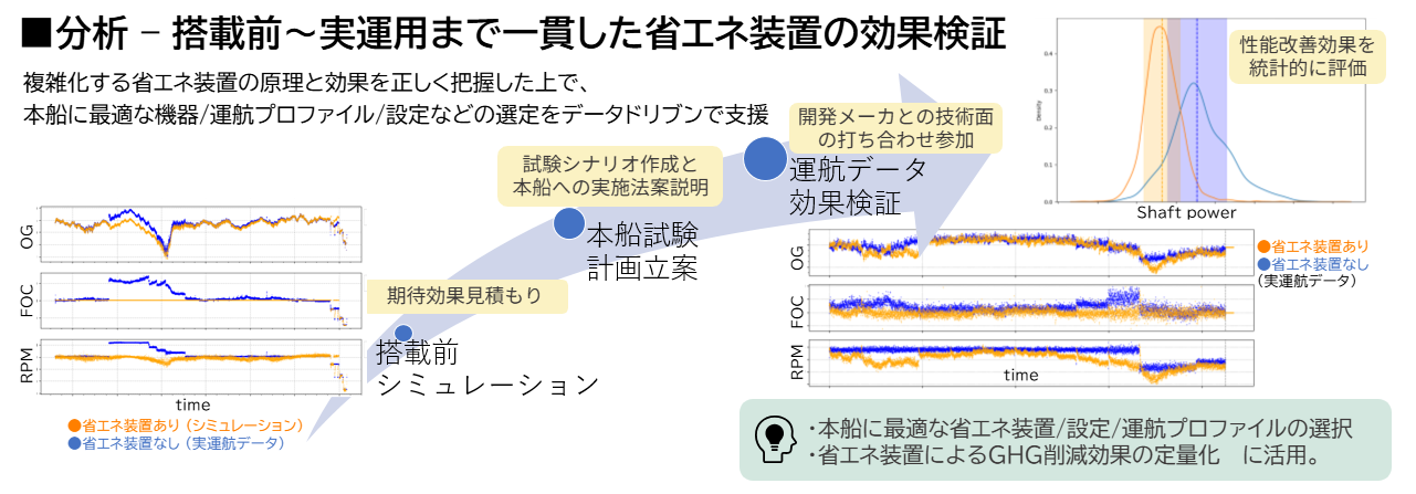 省エネ装置を船舶に搭載しておしまいにするのではなく、搭載後の効果検証を実施することにより、推進性能改善効果を定量的に把握し、他船への横展開や次の一手の検討に進むことが、燃費改善を進める上で重要です。