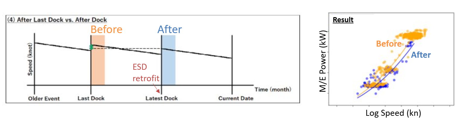 実船での効果検証にあたり、推進性能効率改善技術の原理や特徴に応じた分析アプローチを検討しています。例えば、定期修繕をおこなうドック中に取り付ける機器であれば、搭載前のドック後数か月間の推進性能と、搭載後のドック後数か月間の推進性能を比較対象とし、また解析データの下処理をおこなうことで、搭載機器以外の要因の影響を排除した評価をおこなっています。