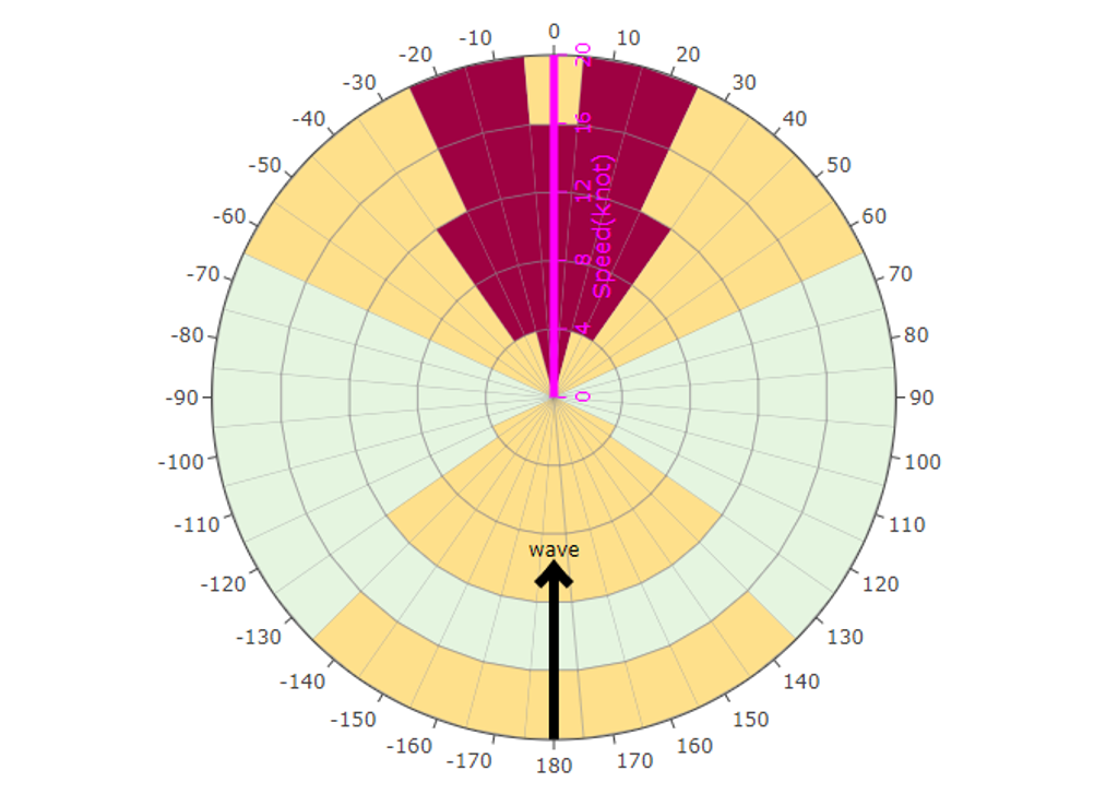 当社では、波浪レーダーによる波浪観測と船体動揺データベースを組み合わせて活用する運航支援システムの研究開発を進めています。船体動揺データベースとは、実運航で想定される積付け条件および遭遇波浪条件からシミュレーションで計算された船体動揺予測のデータベースです。これらを波浪レーダーによる計測データと組み合わせることで、現在の運航条件(積付け条件、波浪条件、船速、針路の組合せ)に対応する船体動揺を推定し、ポーラーチャートとして可視化することが可能となります。ポーラーチャートは、船速や針路に応じた船体動揺リスクを直感的に把握できる図表であり、乗組員が実際の海象下で針路や船速を適切に調整する判断を支援し、船体動揺低減と安全運航の確保に寄与します。